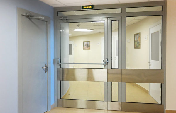 От качества заполнителя зависит, насколько эффективно преграда будет препятствовать распространению высоких температур. Материал должен быть негорючим и стойким к температурным воздействиям. В комплектацию противопожарной алюминиевой двери также входят уплотнители, ручки, замки и иные элементы фурнитуры. Дополнительные фурнитурные детали: доводчики, отбойные пластины, пороги разных типов.